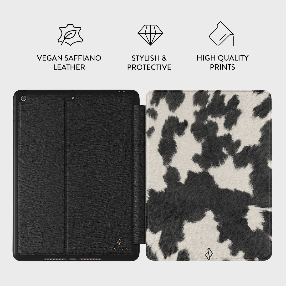 * The case is not textured-it is a printed pattern *Your iPad deserves to look cute and stay protected at all times. and our Achromatic iPad 10.2 (9th/8th/7th Gen) folio case will help you keep it safe and sound. The cow print in black and white is both daring and classic. making it the perfect addition to your accessory collection.
